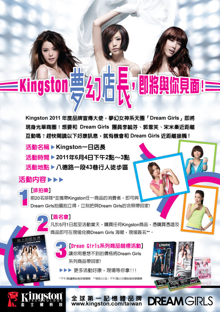 滿人潮,6月初還應代言廠商Kingston的邀請,到光華商圈擔任一日店長舉辦見面會活動,搶看Dream Girls的民眾更是從廣場一路滿